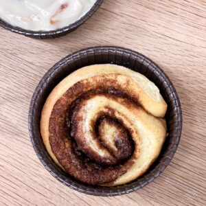 Remove the plastic lid from the baking mold – the base is oven safe so no need to remove that! Place the cinnamon roll on top of a cookie sheet.